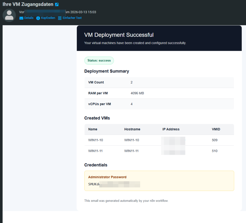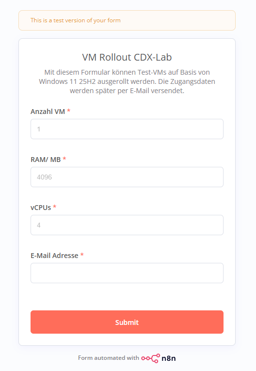 Ein Benutzer beantragt über ein Formular eine neue virtuelle Maschine. Anschließend startet automatisch ein Workflow, der die VM in Proxmox erstellt, per Cloudbase-Init initial konfiguriert, per Ansible weiter vorbereitet und am Ende dem Antragsteller alle relevanten Informationen per E-Mail zusendet.